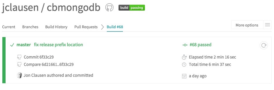 That's it! Once a commit is pushed to one of the project branches, and it passes all of its tests, the latest version is sent up to S3, where the CommandBox command, box install cbmongodb , will install it "automagically"!