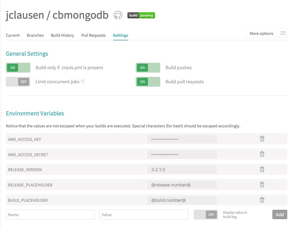 Switch on your module's repo and configure the settings. You'll notice there are also additional environment variables, where you can add secret keys. In the case of CBMongoDB, builds are published to an AWS S3 bucket so I have the variables AWS_ACCESS_KEY and AWS_ACCESS_SECRET set for authentication during the build process.