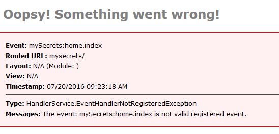 This is a bare bones template for a module controlled by ContentBox, but right now it doesn't really do anything... in fact if you tried to hit the module, the default route for / would look for home hander with index action/view but we haven't created those yet. None of the functions above do anything, so all the activation and deactivation does, is make the module available or not. If you try and access /mysecrets ( the entry point ) with the module deactivated you see this