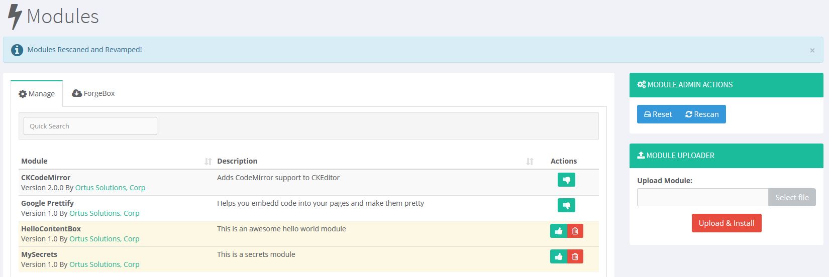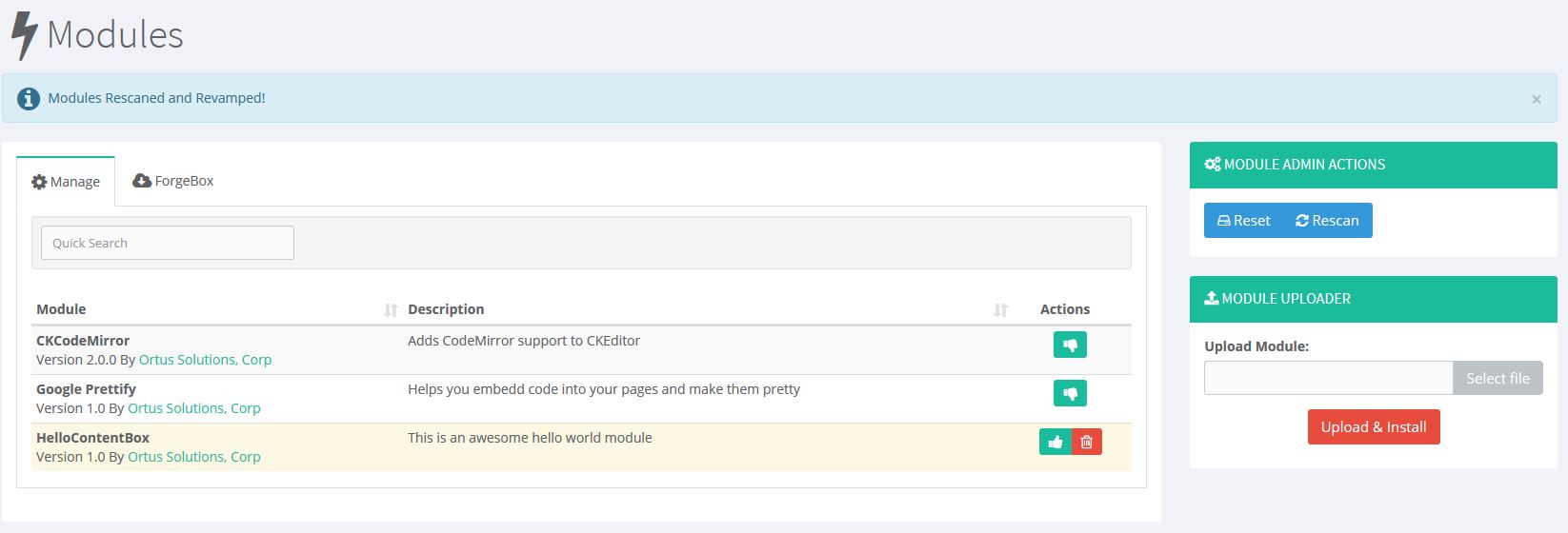 This is the minimum you need for the module to show up in the Manage Modules screen. If we rescan now, you'll see it detects our Module.