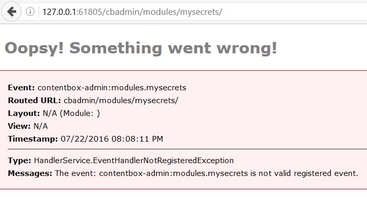 Another note: If you hit http://127.0.0.1:61805/cbadmin/module/mysecrets/ you will get a strange handler error... because it things the module isn't a module, but its an action of a parent module... so make sure you use the full url, like below.