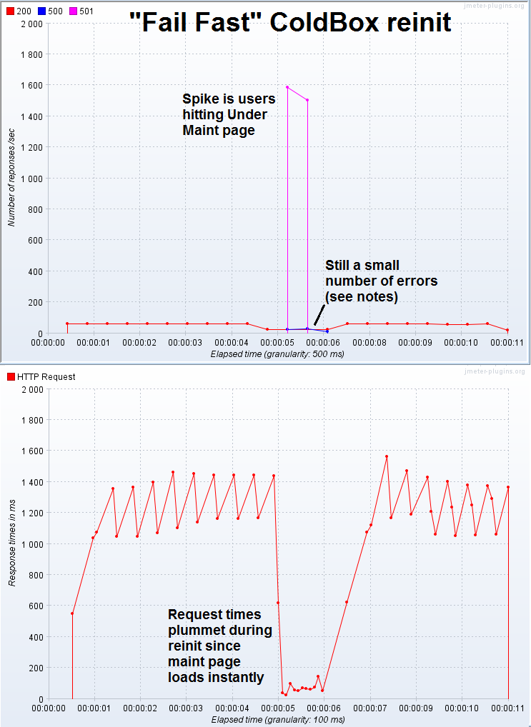 - I returned a 501 status code for the maintenance page so JMeter would report it separately in the graph