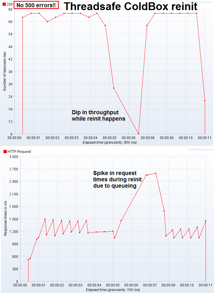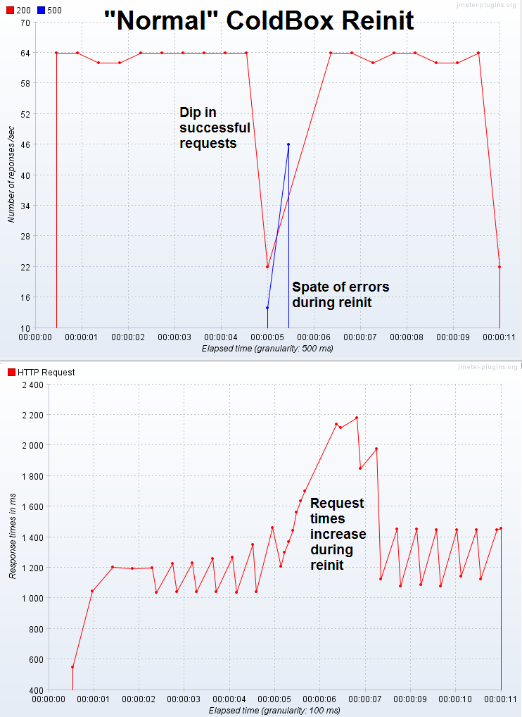 - The second thing the JMeter script does is wait 5 seconds and then fire a single reinit request that falls halfway through the first onslaught of requests