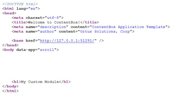 This is another convention. In ColdBox, the default layout for a view is "main", so ColdBox is looking for a main layout for the view. It looks in the module first, in the layouts folder ( which doesn't exist yet ) and there is no /modules_app/customModule/layouts/main.cfm so then it looks in the parent... the main app. Inside of the ContentBox App root, there is a layouts folder, and inside of there, is a Main.cfm. That is found by ColdBox and that is what generates the small amount of layout code wrapping our H1.