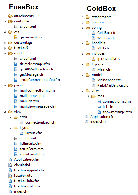 Here's a screenshot of the files in the Fusebox and ColdBox code side-by-side. There are fewer ColdBox files, but not quite as few as the image might imply. Several of the files on the FuseBox side are auto-generated or empty. I'll cover each of them as we go.