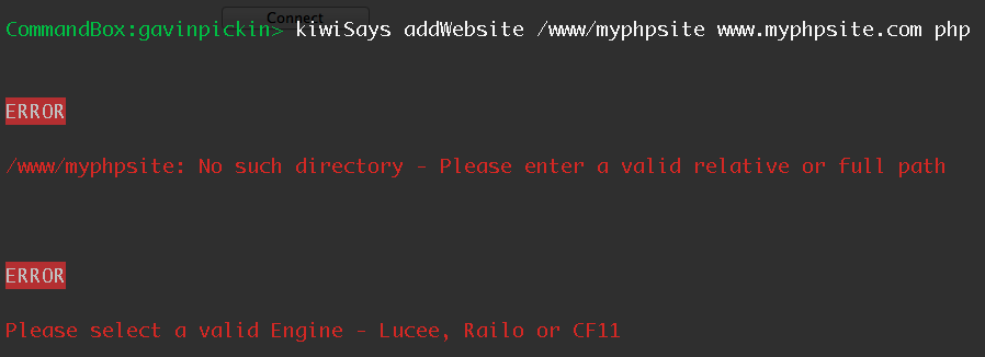 As with any code, if you are concerned it might fail, you can try catch, and rethrow the error for a more useful error message, but CommandBox also has Controlled Errors. Controlled Errors is a function all Command have access to, that allows more user friendly ways to announce an error to a user. You can in fact, report multiple errors in a single command. In my kiwiSays command, I could throw an error for each of the settings required for kiwiSays addWebsite. I could throw an error for a badly formed URL, I could throw an error for a website Root path that does not exist, and if they try and use PHP as their CFML Engine I could nicely inform them that PHP is not a Cool Fab Markup Language Engine.