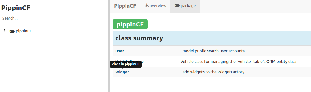 This is all the configuration we need to generate HTML documentation from the command line. Running this command will generate HTML documentation with a search function and a package summary that looks something like this: