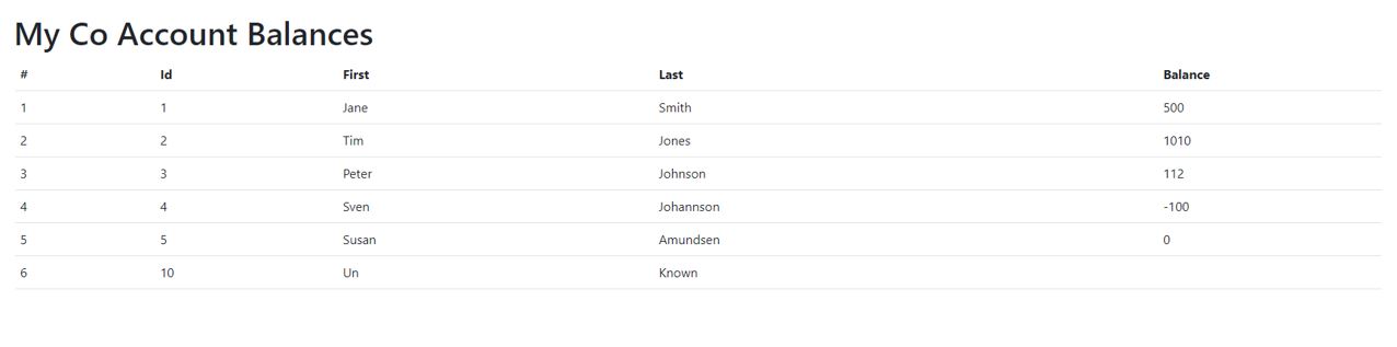 In this scenario, we have an existing index.cfm which gathers data from two cfcs located at com.mycode.people.Accounts and com.mycode.accounting.accounting and presents this table: