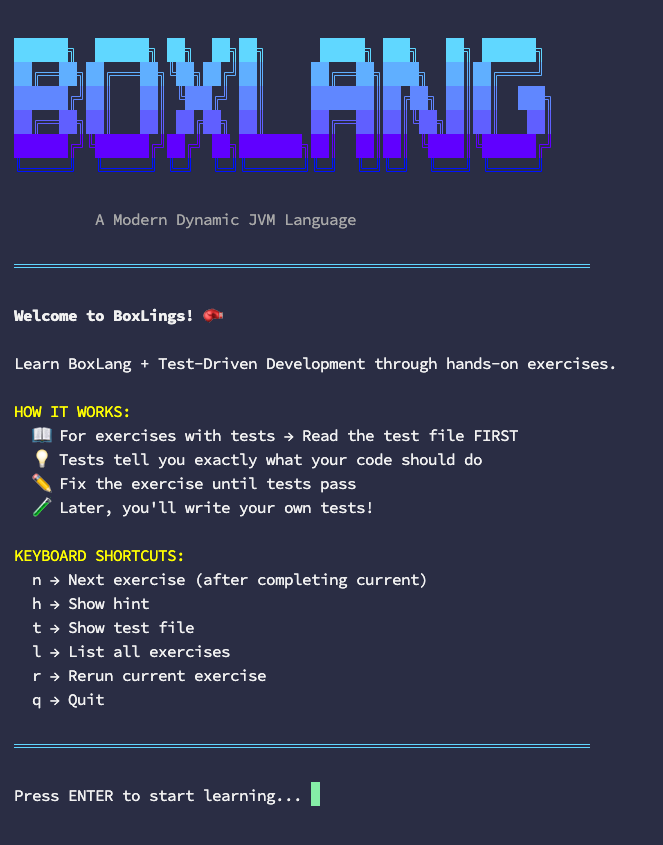 Inspired by the beloved rustlings project, BoxLings is an interactive CLI tool that teaches you BoxLang through hands-on exercises. You read failing tests, fix broken code, and level up β one exercise at a time.