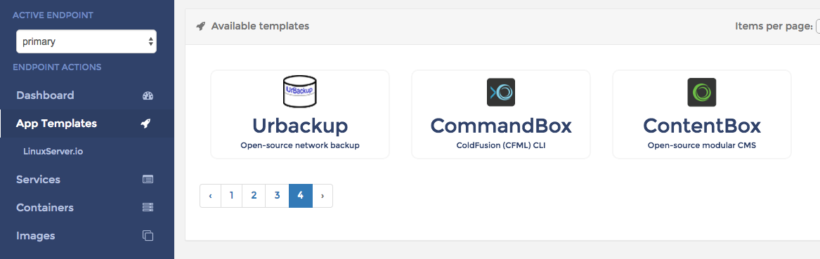 Portainer has the concept of quick application templates for easily deploying applications and trying them out. From here you can navigate their great collection and you will find our two docker images: CommandBox and ContentBox. We will use them to launch CFML applications with CommandBox or a full fledge CMS instance using ContentBox CMS. Below are the screenshots for each template so you can get started with ColdFusion (CFML) and ContentBox CMS with docker: