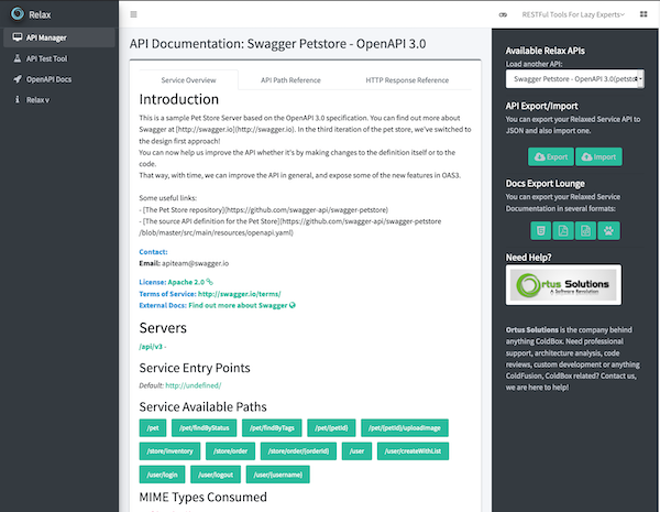 We are so excited to bring you the release of Relax version 4.1.0 for Coldbox. Though the release version is minor, this version contains a number of enhancements to OpenAPI v3 support, including better formatting and display of the new-to-3.0 requestBody schema and properties. In addition the user experience has been greatly improved as the UI has been rewritten in VueJS and is now optimized for displaying large API documents with hundreds of routes and thousands of methods. Enjoy!
