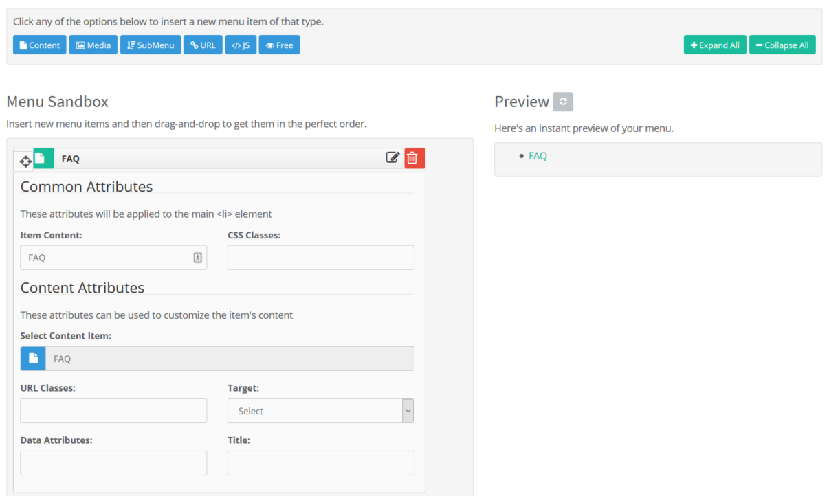 ContentBox's default navigation is based on your Pages. You can add edit and delete pages in the admin under Content > Site Map. Sometimes you need more than page to make your website. The menu manager allows you to create 'Menus' to be used in a variety of ways in your ContentBox Website. A Menu can contains several Items, which can be from a range of Item types, Content like Pages and Blog posts, Media, Submenus, URLs, JS or Free type. Menus are easy to create, and give you a lot more options that relying on pages inside your traditional Sitemap structure.