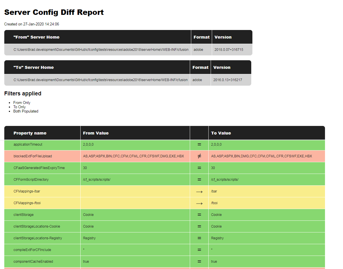 The other nifty thing that George used CFConfig for was nightly reporting to verify if anyone had changed any settings directly in the administrator of the servers. Again, this was done by running CommandBox out of a temporary folder on the machines so nothing was ever "installed", which made it much easier to get approval for the process. CFConfig has a cfconfig diff command that can compare two servers OR a server and a config JSON file and report any differences between the two. We added the ability to export the diff report to HTML or PDF so you can create an audit trail of whether your server's settings match the "gold standard" you define in a JSON file.